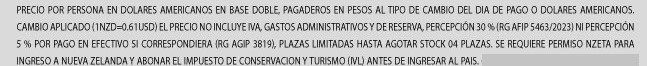 No Incluye: Asistencia al viajero, consultar suplemento.-No incluye Traslados de llegada y de salida. Precios por pasajero Base Doble.- Consultar Family Plan; Base Triple.- En caso de pago en pesos, se deberá adicionar un 30%. Se aplica el cambio Peso/Dólar del día del pago. Cupos limitados. Percepción Afip 3819 no incluida, para pagos en efectivo o por deposito bancario. No aplica Percepción del 5% para transferencia bancaria. Oferta válida hasta agotar la disponibilidad de 10 plazas por salida. Impuestos incluidos. Base Doble.- Precio por pasajero.-Precio sin impuestos: usd 790. Dólares.Operador responsable: Alicante Turismo. E.V.T. -Leg. 9853 Disp.25.